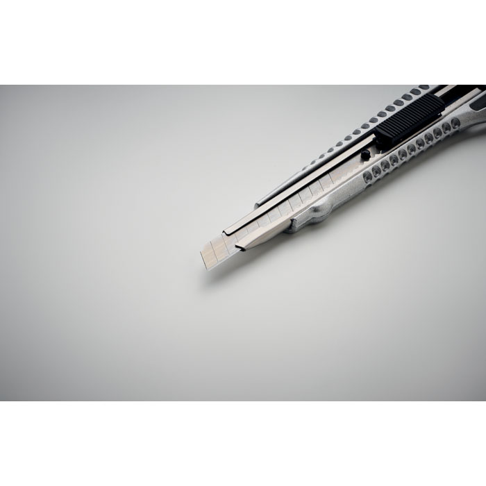 Einziehbares Cuttermesser aus Aluminium mit 13 Klingen aus Karbonstahl.
