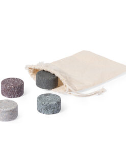 Satz von 4 wiederverwendbaren Eiswürfeln. Hergestellt aus Granit, hält das Getränk kalt, ohne seine Eigenschaften zu verändern, indem es seinen Inhalt nicht in Wasser verdünnt, und behält seinen ursprünglichen Geschmack bei. Präsentiert im Baumwollbeutel mit Kordelzugverschluss.