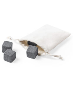 Set aus 4 wiederverwendbaren Eiswürfeln. Hergestellt aus natürlichem Speckstein, der das Getränk kalt hält, ohne seine Eigenschaften zu verändern, indem er seinen Inhalt nicht mit Wasser verdünnt und seinen ursprünglichen Geschmack beibehält. Präsentiert in einem Baumwollbeutel mit Schnurverschluss.