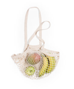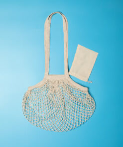 Großer, naturfarbener Netzbeutel aus roher Baumwolle, mit kleiner Falttasche zum Bedrucken – Schnürverschluss -. Lange Henkel und kleine Falttasche für einfachen Transport.