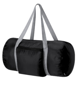 Faltbare Tasche aus 290T RPET. Mit Reißverschluss und Zubehör in Grau und Schwarz. Enthält einen Karabiner für einen einfachen Transport. Einschließlich RPET-Etikett. Das RPET-Material wird aus recyceltem Kunststoff hergestellt, um die Wiederverwendung von Plastikabfällen zu fördern und zur Nachhaltigkeit des Planeten beizutragen.