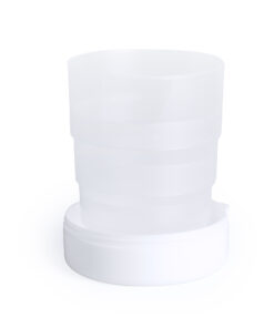 Origineller, faltbarer Notfallbecher in elegantem Weiß. Mit im Deckel integrierter Pillendose und Metallkarabiner.