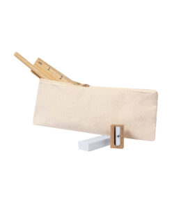 Set mit 4 Teilen präsentiert in einem Baumwolletui mit Reißverschluss. Enthält:- Holzstift mit rundem Körper in natürlichem Finish und schwarzer Mine- 15 cm Lineal mit metrischem System in Zentimetern/Zoll- Radiergummi- Anspitzer
