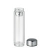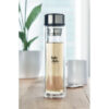 Doppelwandige Flasche aus Borosilikat-Glas. Mit Tee-Sieb. Im Deckel befindet sich eine integrierte Touchscreen LED Temperaturanzeige, die die Temperatur des Getränks anzeigt. Inkl. 1 austauschbare CR2032 – Batterie. Füllmenge: 390 ml. Auslaufsicher.
