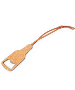 Flaschenöffner aus Kork, der die Form einer Flasche annimmt. Das Design umfasst eine praktische Kordel zum einfachen Tragen und die Möglichkeit, es bequem aufzuhängen. Einzeln präsentiert in einer recycelten Papiertüte.