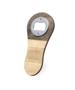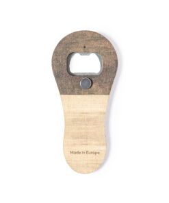 Magnetischer Öffner aus Naturholz mit einer originellen zweifarbigen Oberfläche. Mit Öffnungsmechanismus aus Metall, großer Branding-Fläche und Made in Europe-Logo.