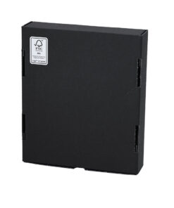 Präsentationsbox mittlerer Größe aus schwarzem Wellpappe. Im Einklang mit dem Marktentwicklungsziel der ganzheitlichen Nachhaltigkeit von Geschenken, die Lösungen bietet, um zur Verbesserung und Erhaltung unseres Planeten beizutragen.