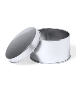 Runde Präsentationsbox aus robustem, silberfarbenem Metall mit passendem Deckel.
