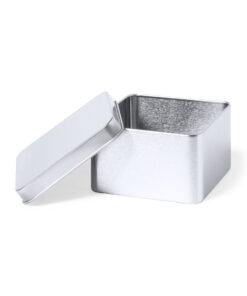 Quadratische Präsentationsbox aus robustem, silberfarbenem Metall mit passendem Deckel.