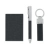 3-teiliges Geschenkset in Geschenkbox. Inkl. Drehkugelschreiber aus Metall mit Details aus RPET-Polyester, Visitenkartenhalter und Schlüsselring aus RPET-Polyester. Blaue Tinte.