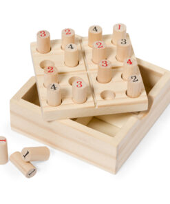 Sudoku-Geschicklichkeitsspiel aus Weichholz. Enthält 16 nummerierte Holzteile, in einer Holzkiste mit Abdeckplatte. Inklusive Spielregeln in Englisch und Spanisch. Einzeln präsentiert in einer Kraft-Design-Box.