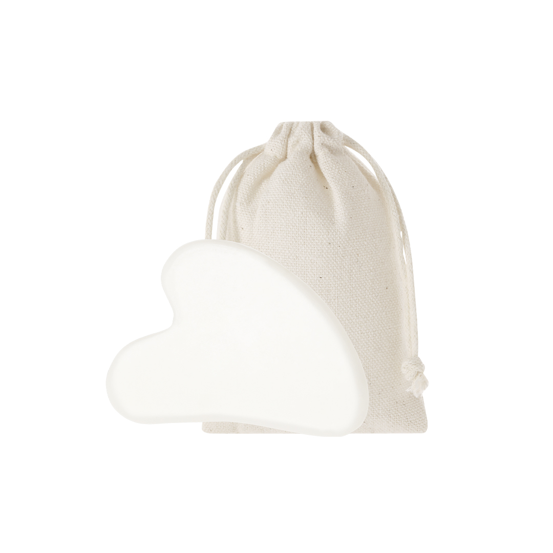 Facial-Massager aus weißem Jade. Ideal zur Ergänzung von Gesichtspflege-Routinen. Präsentiert in einem Beutel aus natürlicher Baumwolle.