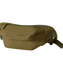 Gürteltasche aus strapazierfähigem 800D-Polyester und sandbraunem Ton. Mit 2 Reißverschlusstaschen und Riemen an Zugbändern zum einfachen Öffnen. Verstellbarer Gurt mit Schnallenverschluss, einzeln verpackt in einer recycelten Tasche.