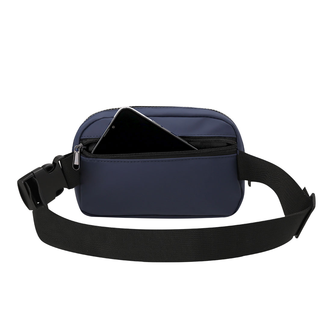 Bauchtasche aus PU-Design. Beinhaltet ein zentrales Fach mit Reißverschluss und einen verstellbaren Gurt mit Schnallenverschluss. Außerdem gibt es eine Rückentasche mit Reißverschluss für zusätzliche Sicherheit.