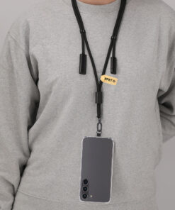 Innovativer Lanyard mit Haltefunktion und Lade-Kabel, hergestellt aus einer Kombination aus RPET-Polyester und recyceltem Aluminium. Entworfen, um sich leicht zwischen der Hülle und dem Smartphone zu platzieren, dank seines Transportzubehörs. Enthält passendes Band, drehbarer schwarzer Karabiner und Sicherheitszubehör für den Hals. Bietet Lade- und Datenübergabefunktion, mit USB- und Typ-C-Eingang und Micro-USB-, Lightning- und Typ-C-Ausgängen. Präsentiert ein RPET-Zeichen auf einem Kraftetikett, das sein Engagement für Nachhaltigkeit hervorhebt.Das RPET-Material wird aus recyceltem Kunststoff hergestellt, um die Wiederverwendung von Plastikabfällen zu fördern und die Nachhaltigkeit des Planeten zu unterstützen.Recyceltes Aluminium ist ein Material mit nahezu unendlichen Recyclingmöglichkeiten, ohne dabei seine ursprünglichen Eigenschaften zu verlieren und weniger Energie in diesem Prozess zu verbrauchen.GRS-Zertifizierung (Global Recycled Standard), die die recycelte Herkunft des für die Herstellung des Produkts verwendeten Materials garantiert.
