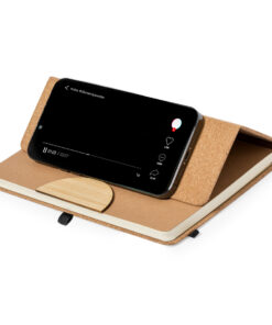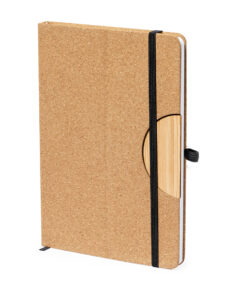 Notebook mit Hardcover aus Kork und mit vielseitiger Smartphone- und Tablet-Halterung im Vorderdeckel integriert. Inklusive elastischem Verschlussband und passendem Stifthalter in schwarzer Farbe. 100 Innenblätter mit Einzelstreifen-Layout, verpackt in einer einzelnen recycelten Tasche.
