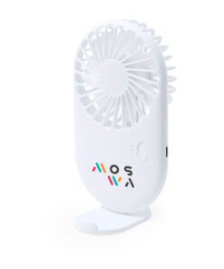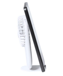 Tragbarer Ventilator aus robustem ABS. Mit drei Geschwindigkeiten und integrierter Smartphone-Halterung. Stromversorgung durch einen 300-mAh-Akku mit Ladezustandsanzeige und Micro-USB-Kabel im Lieferumfang enthalten. Einzeln verpackt in einer Kraft-Design-Box.