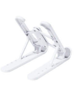 Faltbarer Tablet-Ständer. Hergestellt aus widerstandsfähigem ABS mit rutschfesten Schutzmaßnahmen für einen festen Halt am Gerät in Grau. Höhenverstellbar in 5 Positionen und kompakt zusammenklappbar.