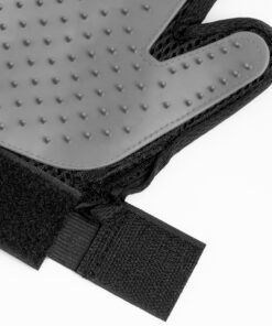 Haustierbürstenhandschuh aus weichem Polyester und TPR. Entwickelt, um Haustieren Komfort zu bieten, einfach zu bedienen und ergonomisch gestaltet, mit anpassbarem Klettverschluss. Die weichen TPR-Borsten fangen lose Haare auf und ermöglichen ein einfaches und angenehmes Bürsten.