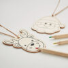 Set mit 3 Anhängern aus Holz und 4 Buntstiften. Lieferung in einer Schachtel aus Kraftpapier. Holz ist ein natürliches Produkt, es kann daher zu leichten Abweichungen in Farbe, Dekor und Maßen kommen.