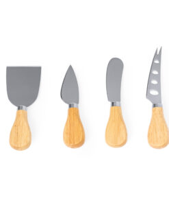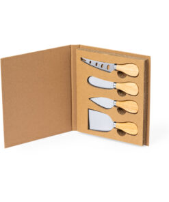 Käseset aus Holz. Utensilien aus Edelstahl und Holzgriff, in vier verschiedenen Ausführungen: für Hartkäse, Weichkäse, Schnittkäse und Käsestücke. Präsentiert in einer Originalschachtel aus recyceltem Karton mit einer Ausstanzung für jedes Zubehörteil.