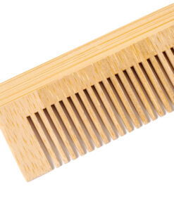 Kamm aus poliertem Bambus mit gleich großen Borsten. Einzeln verpackt in einer recycelten Papiertüte.