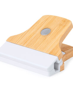 Clip für Notizzettel aus Bambus. Mit starkem Magneten zur Befestigung an Metalloberflächen und zweifarbigem Design in Weiß und Bambusholz. Präsentiert in einer individuellen Tasche.