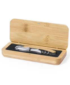 Naturkorkenzieher mit Flaschenöffner und Kapselschneider. Hergestellt aus einer Kombination von Bambus und Metall, die natürliche Materialien mit langlebigen Materialien verbindet. Präsentiert in einem individuellen, polierten Bambusetui mit gestanzter EVA-Innenseite und in einer attraktiven, individuellen Box im Öko-Design.