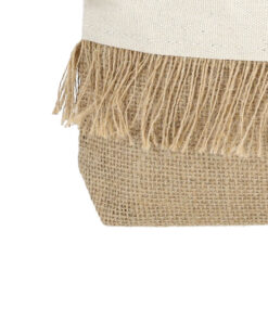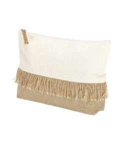 Necessaire aus laminiertem Jute und natürlicher Baumwolle. Mit auffälligen Fransen, Reißverschluss in natürlicher Farbe und Juteband.