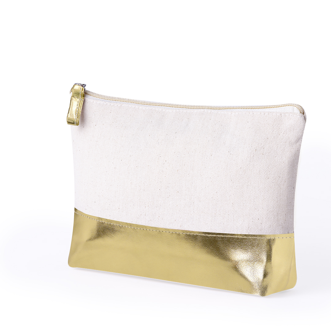 Kosmetiktasche aus recyceltem Baumwollmaterial mit 220 g/m2. Mit Reißverschluss passend zum Boden und erhältlich in Naturfarbe mit Metallic-Finish PU-Leder Boden.