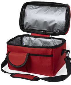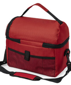 Vielseitig verwendbare Kühltasche aus strapazierfähigem 600D Polyester in lebendigen Farben. Mit zwei separaten Fächern mit Reißverschluss sowie 2 Außentaschen – eine mit Klettverschluss auf der Vorderseite und eine mit elastischem Netz auf der Rückseite. Mit verstellbarem Schultergurt mit Karabinerbefestigung und farblich passendem, verstärktem Schulterpolster.