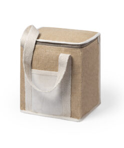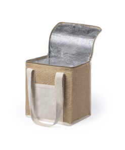 Nature Line Kühltasche mit extra Höhe. Hergestellt aus laminierter, feuchtigkeitsbeständiger Jute, mit isothermischer Innenausstattung aus Aluminium und passendem Reißverschluss. Griffe und Außentasche für Baumwollmarkierung.