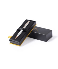 Kugelschreiber mit einziehbarem Mechanismus, auffälliges zweifarbiges Design in Weiß mit eleganten roségoldenen Akzenten. Metallgehäuse mit glatter Oberfläche und originellem Clip mit Logo. Präsentiert in einem eleganten schwarzen Einzelgehäuse mit dem Logo der Marke und einem passenden, weichen, wildlederähnlichen Innenraum. Mit schwarzer Tinte.