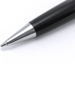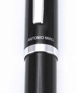Kugelschreiber von Antonio Miró mit elegantem, zweifarbigem Design und geschmeidigem Metallschaft in schlichtem Schwarz. Mit dem Markenlogo auf dem Ring, sowie Clip und Spitze in glänzendem Silber. Präsentiert in einer individuellen Schachtel in Schwarz mit dem Markenlogo. Jumbo-Patrone mit blauer Tinte.