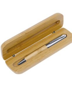 Eleganter Kugelschreiber aus Bambus und Metall mit Drehmechanismus. Robuster Metallschaft mit glänzender Oberfläche und Bambusgriff. Metallclip und blaue Tinte. Präsentiert in einem individuellen Bambusetui.