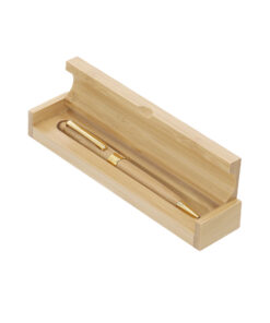 Eleganter Kugelschreiber aus einer Kombination von natürlichem Bambus und metallischen Elementen mit goldenem Finish, mit Drehemechanismus und blauer Tinte. Präsentiert in einer eleganten Bambusverpackung.Materialien wie Bambus fördern die Verwendung natürlicher Rohstoffe und reduzieren die Schadstoffemissionen. Zudem stammt der Bambus von einer sehr stabilen und vielseitigen Pflanze, die schnell wächst und sich regeneriert, was ihn zu einer hervorragenden Alternative zur Verwendung von traditionellem Holz macht.
