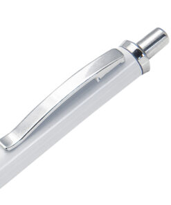 Druck-Kugelschreiber mit elegantem, zweifarbigem Design und Kontrastelementen in glänzendem Silber sowie Körper in glänzendem Weiß mit der spanischen Nationalflagge. Mit Metallclip und Jumbo-Patrone mit blauer Tinte.