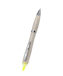Praktischer Kugelschreiber aus Weizenstroh und ABS, inklusive Marker. Drehmechanismus und blaue Tinte. Auf der Oberseite des Stifts befindet sich ein praktischer gelber Textmarker mit Kappe. Weizenstroh-Logo auf der Oberseite des Kugelschreibers, mit Metallclip und -beschlägen und einem naturfarbenen Schaft.Weizenstroh fördert die Verwendung von natürlichen Rohstoffen und reduziert so den Schadstoffausstoß.
