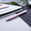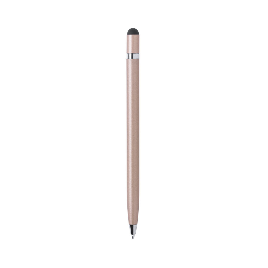 Dreh-Kugelschreiber mit Stylus aus Aluminium mit geschmeidigem Metallic-Finish und verchromtem Ring. Erhältlich in Gold, Rosa und Silber in glänzender Ausführung sowie Weiß in matter Ausführung. Blaue Tinte.
