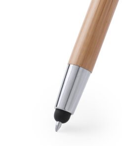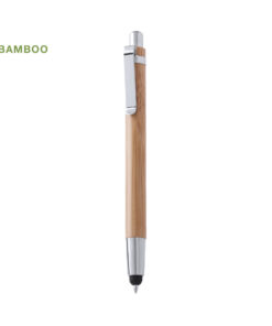 Eleganter Druck-Kugelschreiber mit Stylus und Schaft aus natürlichem Bambusholz mit Kontrastdetails in glänzendem Silber-Metallic. Jumbo-Patrone mit blauer Tinte.