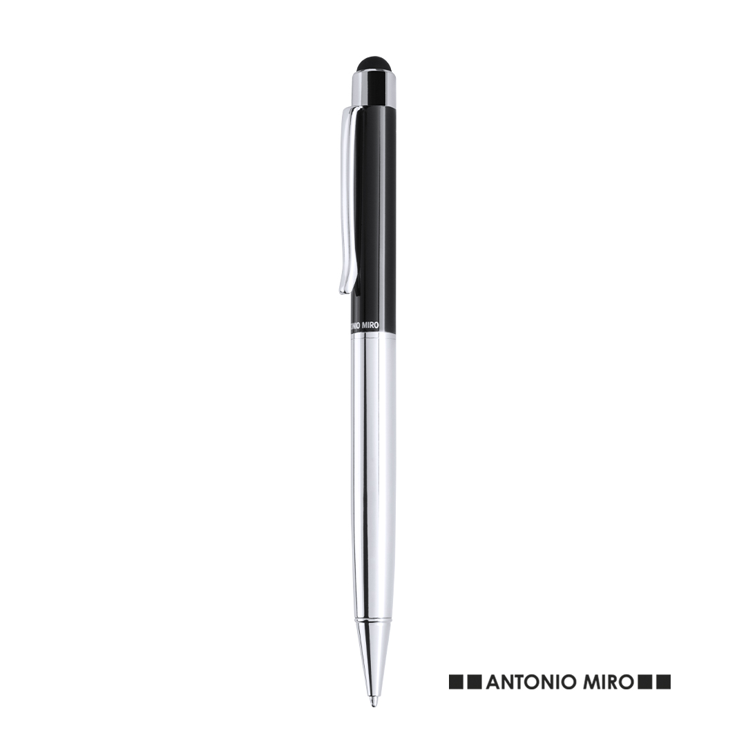 Dreh-Kugelschreiber von Antonio Miró mit geschmeidigem Metallschaft in einer eleganten Schwarz/Silber-Kombination. Mit Clip und Spitze in passender Farbe. Präsentiert in einer individuellen schwarzen Schachtel mit dem Markenlogo. Blaue Tinte.
