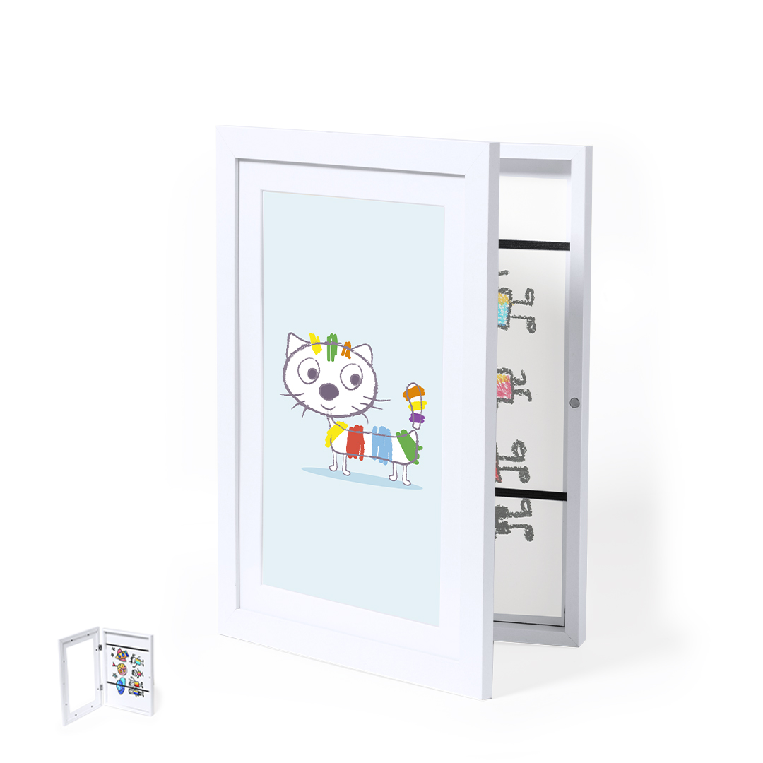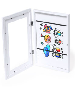 Eleganter Kunstrahmen, der Funktionalität und Stil vereint. Mit einem Fach zur Aufbewahrung von A4-Designs, die durch elastische Bänder an Ort und Stelle gehalten werden, während der Deckel über einen Rahmen zur Präsentation des ausgewählten Kunstwerks verfügt. Mit Klappöffnung und Magnetverschluss für eine praktische und sichere Bedienung. Einzeln präsentiert in einer Kraft-Designbox.