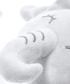 Zartes Doudou mit niedlichen weißen Elefanten Design. Mit Knoten in jeder der 3 Ecken, um den Tastsinn des Babys zu stimulieren und die Entspannung zu fördern. Hergestellt aus einem einzigen Stück Stoff, um zu verhindern, dass es in kleinere Stücke zu trennen ist.