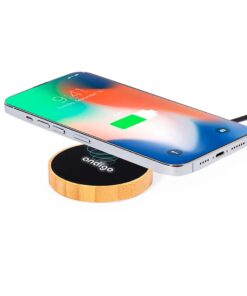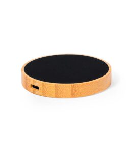 Kreisförmiges kabelloses Ladegerät. Hergestellt aus Bambus, mit eleganter schwarzer Oberfläche. Innere LED-Beleuchtung und äußere Beschichtung speziell für die Lasermarkierung entwickelt, beleuchtet das Logo. Mit 15 W Ladefunktion, kompatibel mit Geräten, die mit der kabellosen Qi-Ladetechnologie ausgestattet sind. Mit rutschfestem Standfuß, inklusive Typ-C-Ladekabel und Bedienungsanleitung in Englisch und Spanisch. Präsentiert in einer individuellen Kraft-Design-Box.