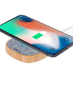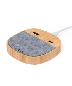 Drahtloses Ladegerät aus Bambus und RPET-Filz. Ladefunktion von 15 W und kompatibel mit Geräten, die mit Qi-Technologie ausgestattet sind. Enthält 2 Ausgänge zum Laden mehrerer Geräte: 1 USB-Ausgang und 1 Typ-C-Ausgang. Mit RPET-Etikett. Große Beschriftungsfläche, präsentiert in einer attraktiven Kraftbox.Der recycelte RPET-Filz ist das Ergebnis der Kombination des Recyclingprozesses von Kunststoffen mit der tausendjährigen Technik der Filzherstellung, was zu einem Öko-Trendmaterial führt, das nicht nur recycelt, sondern auch wiederverwertbar ist.