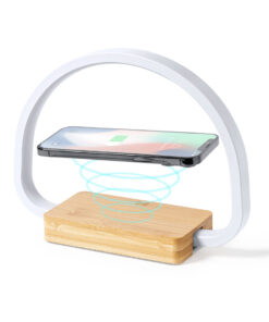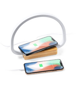 Öko-Design Ladelampe. Hergestellt aus Bambus aus natürlichen Stecklingen und mit rutschfestem Fuß. Integriertes kabelloses 10W-Ladegerät. Enthält 52 LEDs und 3 Leuchtstufen (warm, kalt und mittel) mit einstellbarer Lichtintensität. Kompatibel mit mobilen Geräten mit kabellosem Ladegerät und USB-Anschluss. Inklusive Typ-C-Ladekabel und in attraktiver Öko-Design-Verpackung. Gebrauchsanweisung in Spanisch und Englisch erhältlich.