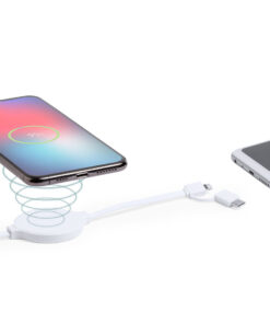 Kabelloses, ultrakompaktes Ladegerät in monochromer, weißer Farbe. Anschlüsse Dual-Micro-USB und Lightning, mit Typ-C-Adapter und Ladekontrollanzeige. Kompatibel mit Geräten, die mit kabelloser Ladetechnologie ausgestattet sind.