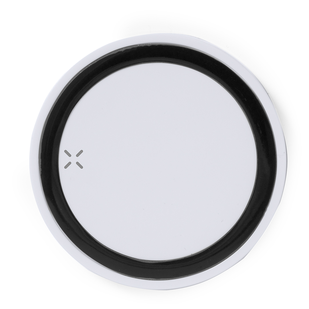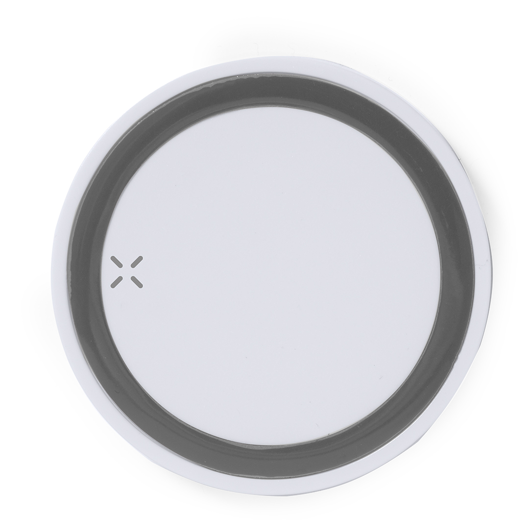 Zweifarbiges rundes kabelloses Ladegerät. Mit rutschfester Unterseite und LED-Anzeige für den Ladestatus. Kompatibel mit Smartphones mit kabelloser Ladetechnologie und präsentiert in einer attraktiven Designbox.