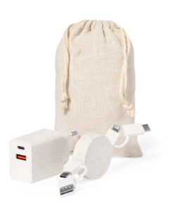 Set aus USB-Wandladegerät mit Schnellladung und Ladekabel mit Datenübertragung, hergestellt aus Weizenfaser. Ladegerät mit USB- und Typ-C-Ausgang und verlängerbarem Kabel mit Micro USB-, Typ-C- und Lightning-Anschluss. Europäischer Stecker. Präsentiert in einem Beutel aus natürlicher Rohbaumwolle mit Kordelzugverschluss.Das Weizenrohr fördert die Verwendung von natürlichen Rohstoffen und reduziert so die Schadstoffemissionen.