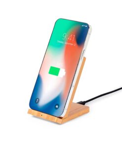 Kabelloses Ladegerät mit Smartphone-Haltefunktion. Hergestellt aus Bambus, mit eleganter schwarzer Oberfläche. Innere LED-Leuchte und äußere Beschichtung speziell für die Laserbeschriftung entwickelt, wodurch das Logo beleuchtet wird. Mit 15 W Ladefunktion und kompatibel mit Geräten, die mit Qi-Technologie ausgestattet sind. Große Beschriftungsfläche und präsentiert in einer attraktiven Kraft-Design-Box.